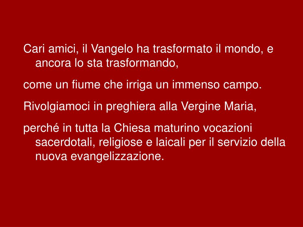 Cari amici, il Vangelo ha trasformato il mondo, e ancora lo sta trasformando, come un fiume che irriga un immenso campo. Rivolgiamoci in preghiera alla Vergine Maria, perché in tutta la Chiesa maturino vocazioni sacerdotali, religiose e laicali per il servizio della nuova evangelizzazione.