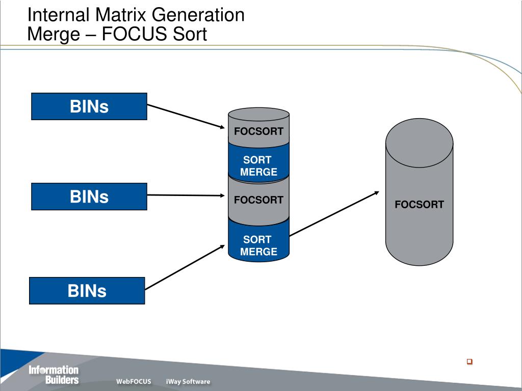 FOCSORT BINs ~ First 5000 Records FOCSORT S001WK01 SORT MERGE S001WK02 S001WK03 EXTSORT S001WK04 BINs Subsequent Records S001WK05 S001WK06 S001WK07 S001WK08 S001WK09 Internal Matrix GenerationEXTSORT = ON, AUTOTABLEF = OFF FOCSORT q