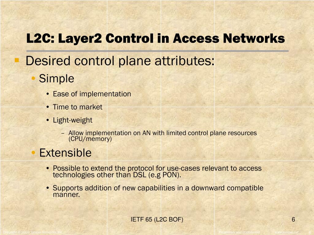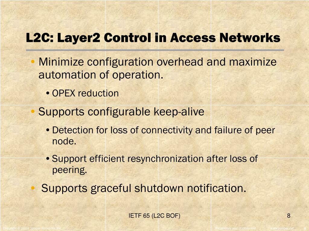 L2C: Layer2 Control in Access Networks • Minimize configuration overhead and maximize automation of operation. • OPEX reduction • Supports configurable keep-alive • Detection for loss of connectivity and failure of peer node. • Support efficient resynchronization after loss of peering. • Supports graceful shutdown notification. IETF 65 (L2C BOF)