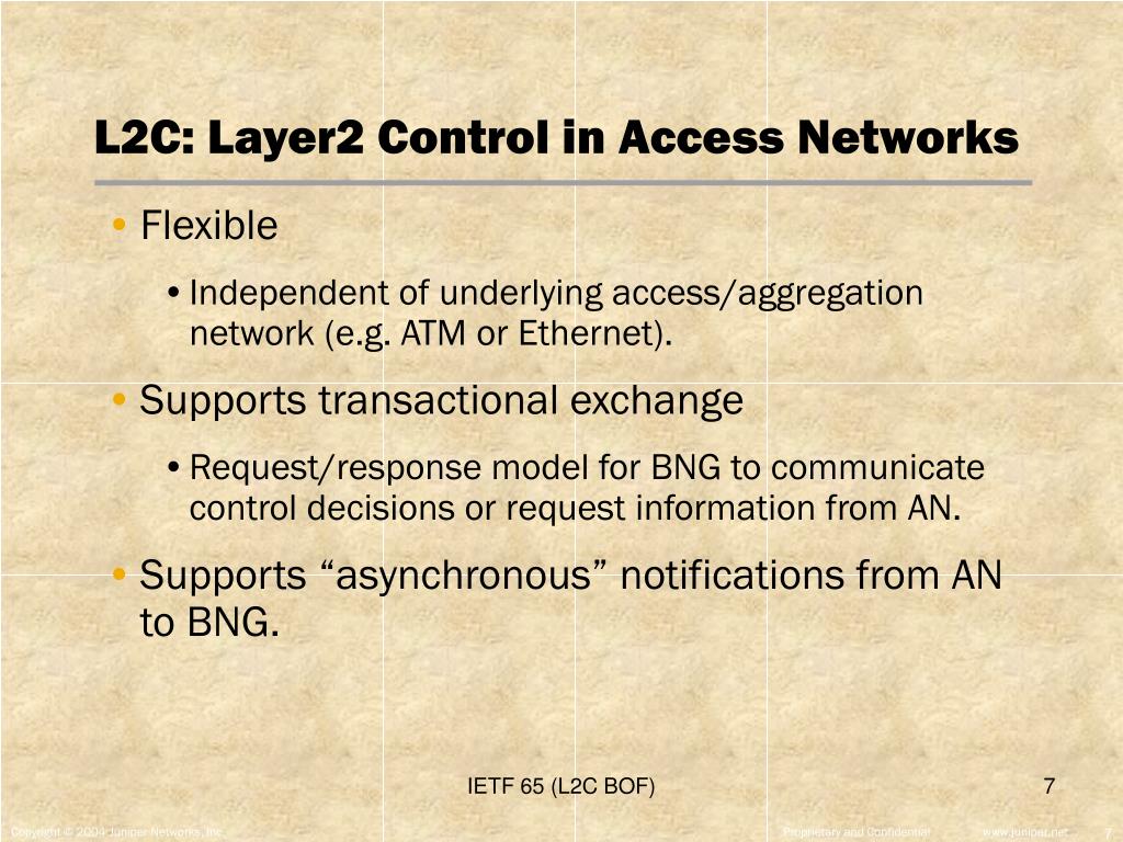 L2C: Layer2 Control in Access Networks • Flexible • Independent of underlying access/aggregation network (e.g. ATM or Ethernet). • Supports transactional exchange • Request/response model for BNG to communicate control decisions or request information from AN. • Supports “asynchronous” notifications from AN to BNG. IETF 65 (L2C BOF)