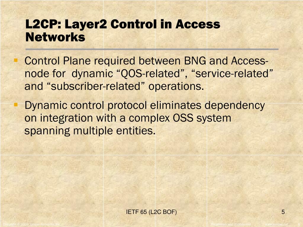 L2CP: Layer2 Control in Access Networks • Control Plane required between BNG and Access-node for dynamic “QOS-related”, “service-related” and “subscriber-related” operations. • Dynamic control protocol eliminates dependency on integration with a complex OSS system spanning multiple entities. IETF 65 (L2C BOF)