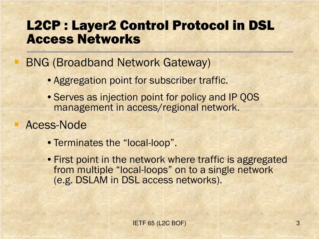 L2CP : Layer2 Control Protocol in DSL Access Networks • BNG (Broadband Network Gateway) • Aggregation point for subscriber traffic. • Serves as injection point for policy and IP QOS management in access/regional network. • Acess-Node • Terminates the “local-loop”. • First point in the network where traffic is aggregated from multiple “local-loops” on to a single network (e.g. DSLAM in DSL access networks). IETF 65 (L2C BOF)