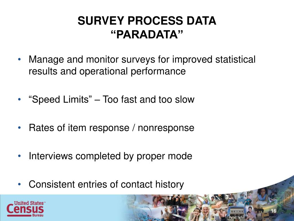 SURVEY PROCESS DATA“PARADATA” • Manage and monitor surveys for improved statistical results and operational performance • “Speed Limits” – Too fast and too slow • Rates of item response / nonresponse • Interviews completed by proper mode • Consistent entries of contact history