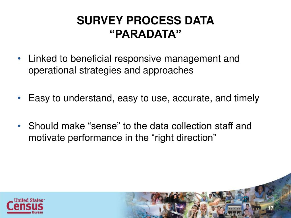 SURVEY PROCESS DATA“PARADATA” • Linked to beneficial responsive management and operational strategies and approaches • Easy to understand, easy to use, accurate, and timely • Should make “sense” to the data collection staff and motivate performance in the “right direction”