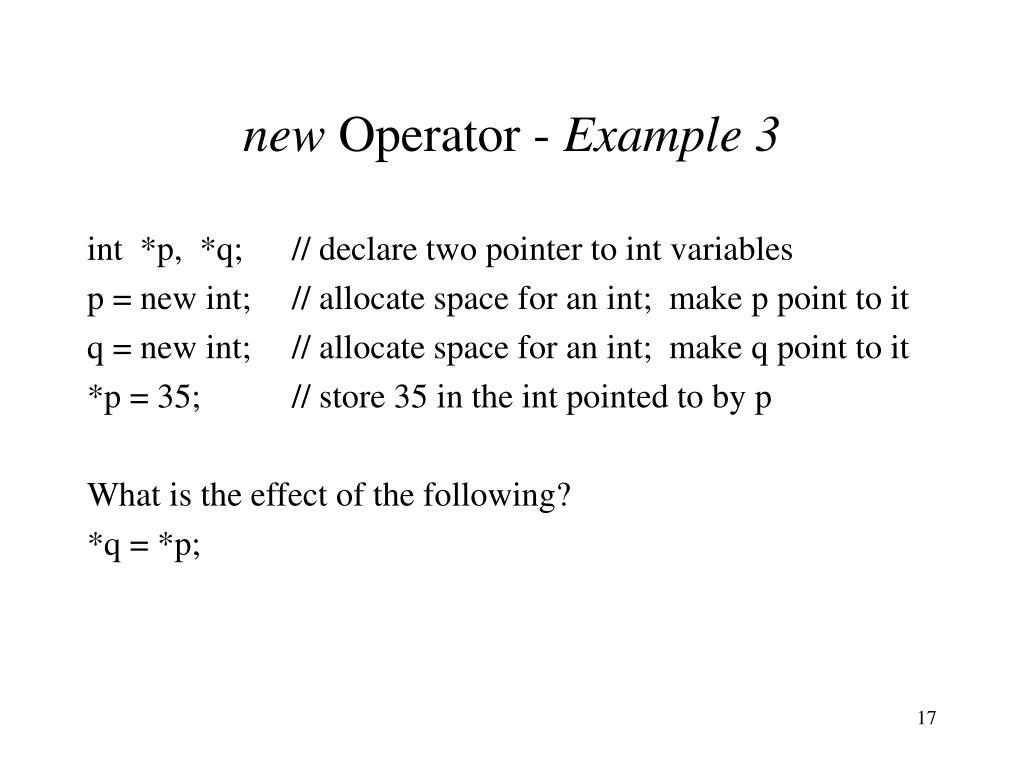 new Operator - Example 3 int *p, *q; // declare two pointer to int variables p = new int; // allocate space for an int; make p point to it q = new int; // allocate space for an int; make q point to it *p = 35; // store 35 in the int pointed to by p What is the effect of the following? *q = *p;