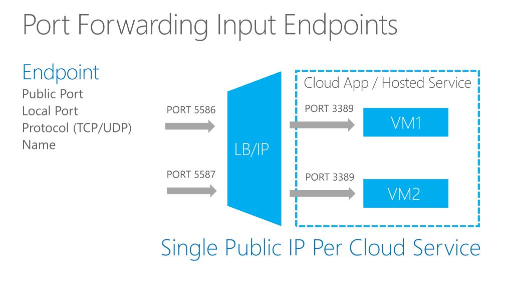 Port Forwarding Input Endpoints Endpoint Public Port Local Port Protocol (TCP/UDP) Name Cloud App / Hosted Service PORT 3389 PORT 3389 PORT 5587 PORT 5586 LB/IP VM1 VM2 Single Public IP Per Cloud Service