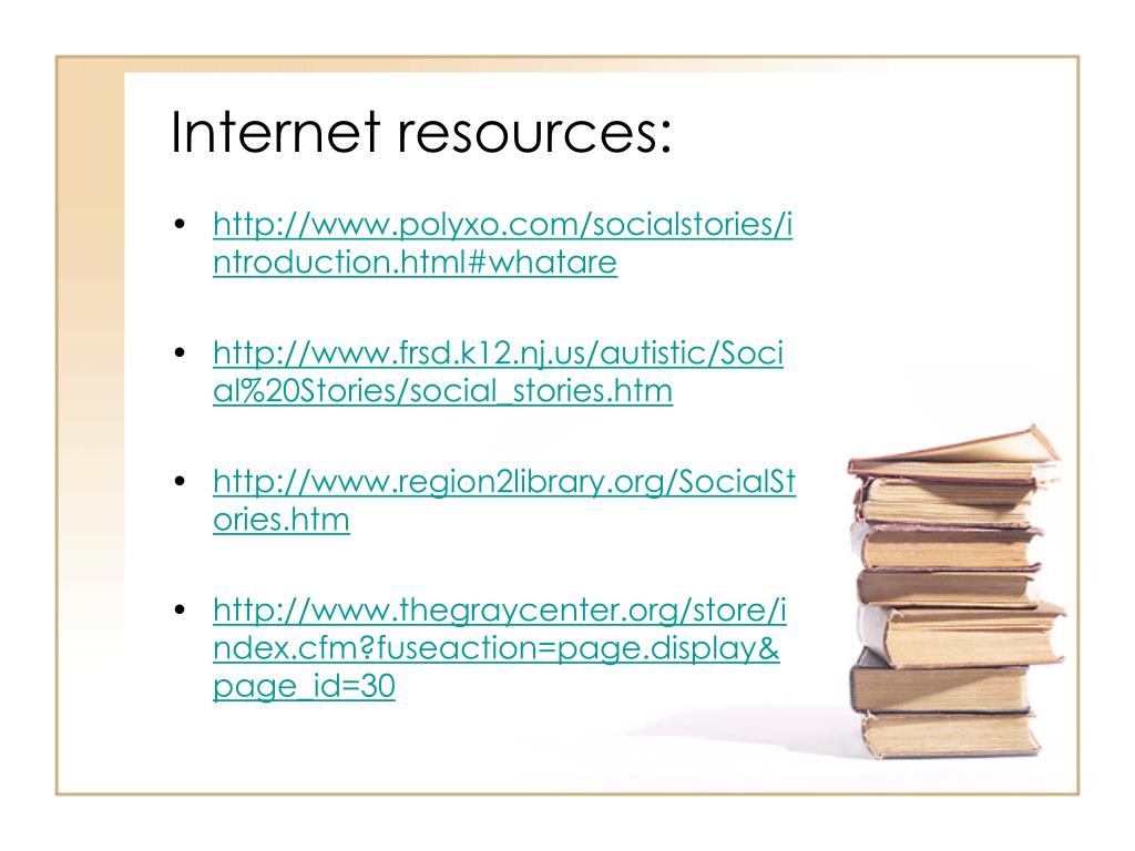 Internet resources: • http://www.polyxo.com/socialstories/introduction.html#whatare • http://www.frsd.k12.nj.us/autistic/Social%20Stories/social_stories.htm • http://www.region2library.org/SocialStories.htm • http://www.thegraycenter.org/store/index.cfm?fuseaction=page.display&page_id=30