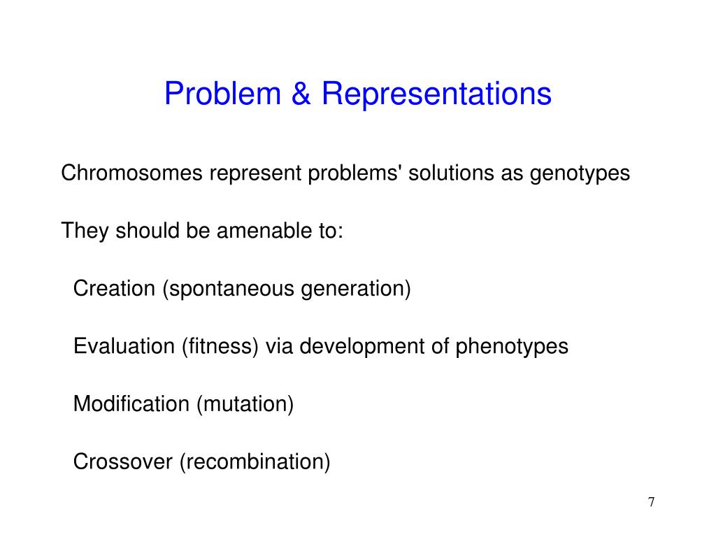 Problem & Representations Chromosomes represent problems' solutions as genotypes They should be amenable to: Creation (spontaneous generation) Evaluation (fitness) via development of phenotypes Modification (mutation) Crossover (recombination)