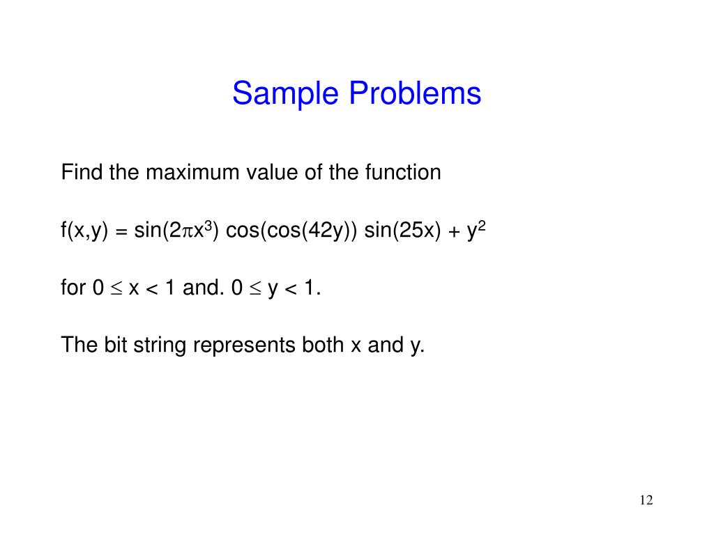 Sample Problems Find the maximum value of the function f(x,y) = sin(2x3) cos(cos(42y)) sin(25x) + y2 for 0 x < 1 and. 0 y < 1. The bit string represents both x and y.