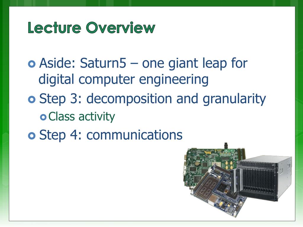 Aside: Saturn5 – one giant leap for digital computer engineering • Step 3: decomposition and granularity • Class activity • Step 4: communications Lecture Overview