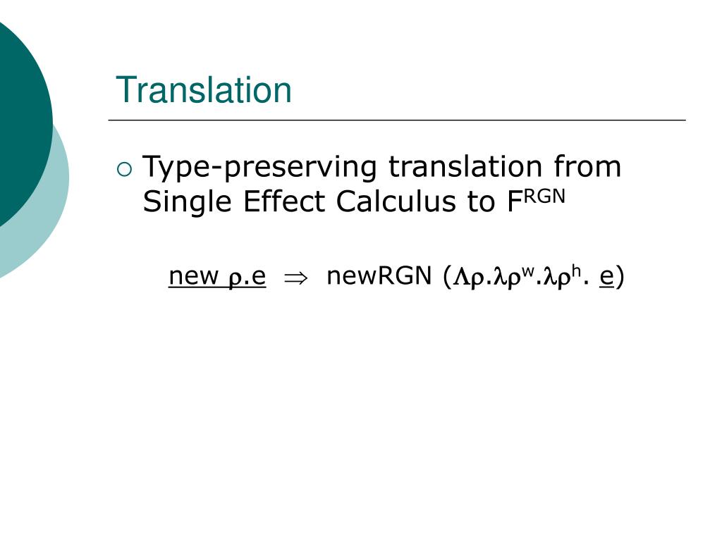 Translation • Type-preserving translation from Single Effect Calculus to FRGN new .e newRGN (.w.h. e)