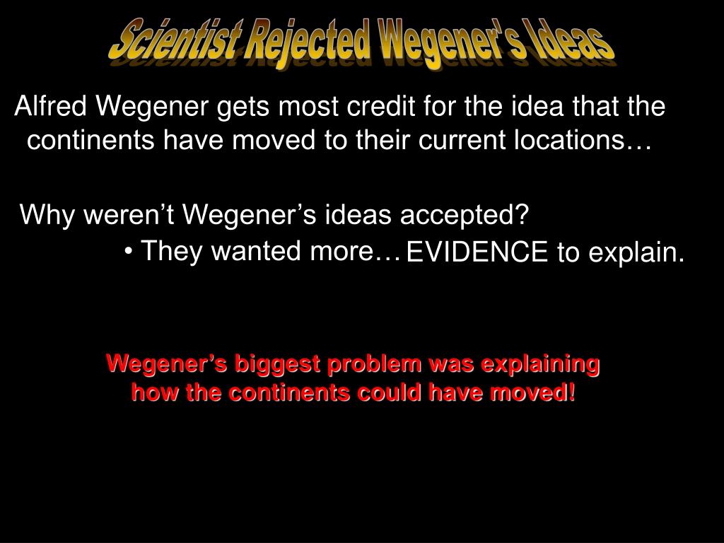 Scientist Rejected Wegener's Ideas Alfred Wegener gets most credit for the idea that the continents have moved to their current locations… Why weren’t Wegener’s ideas accepted? • They wanted more… EVIDENCE to explain. Wegener’s biggest problem was explaining how the continents could have moved!