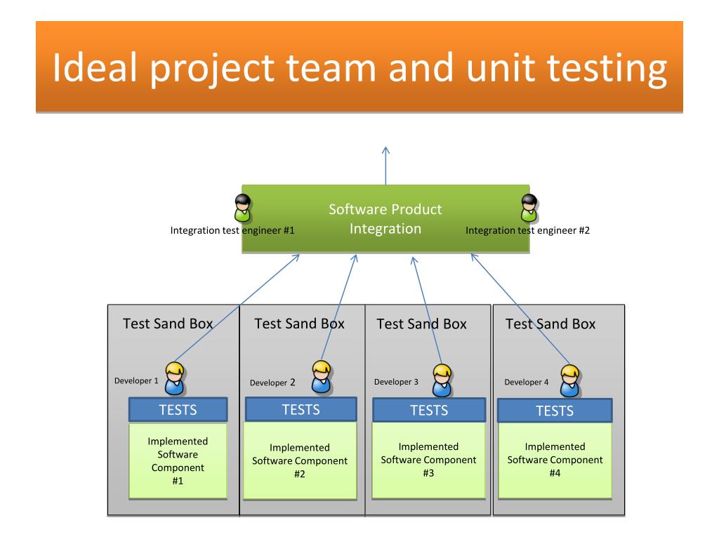 Ideal project team and unit testing Software Product Integration Integration test engineer #1 Integration test engineer #2 Test Sand Box Test Sand Box Test Sand Box Test Sand Box Developer 1 Developer 2 Developer 3 Developer 4 TESTS TESTS TESTS TESTS Implemented Software Component #3 Implemented Software Component #4 Implemented Software Component #2 Implemented Software Component #1