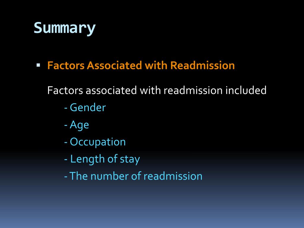 Summary Factors Associated with Readmission Factors associated with readmission included - Gender - Age - Occupation - Length of stay - The number of readmission