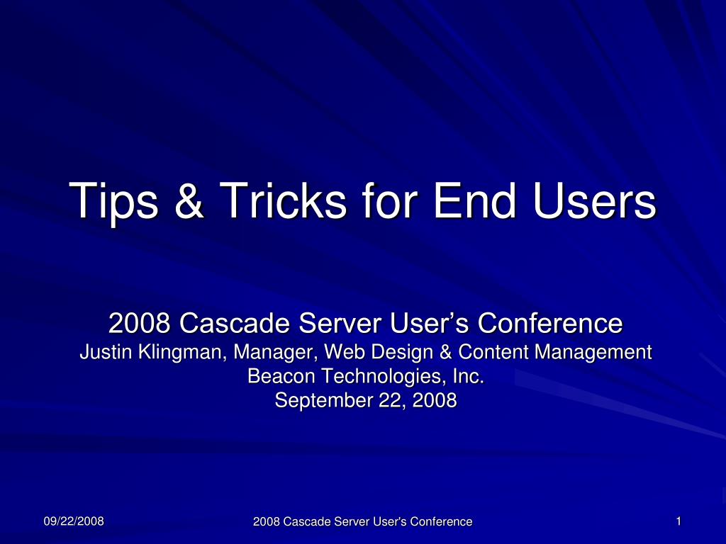 Tips & Tricks for End Users. 2008 Cascade Server User’s Conference Justin Klingman, Manager, Web Design & Content Management Beacon Technologies, Inc. September 22, 2008. Introduction. Who am I? Beacon Technologies, Inc. 10 th -year anniversary Automate, Grow, and Showcase Your Business