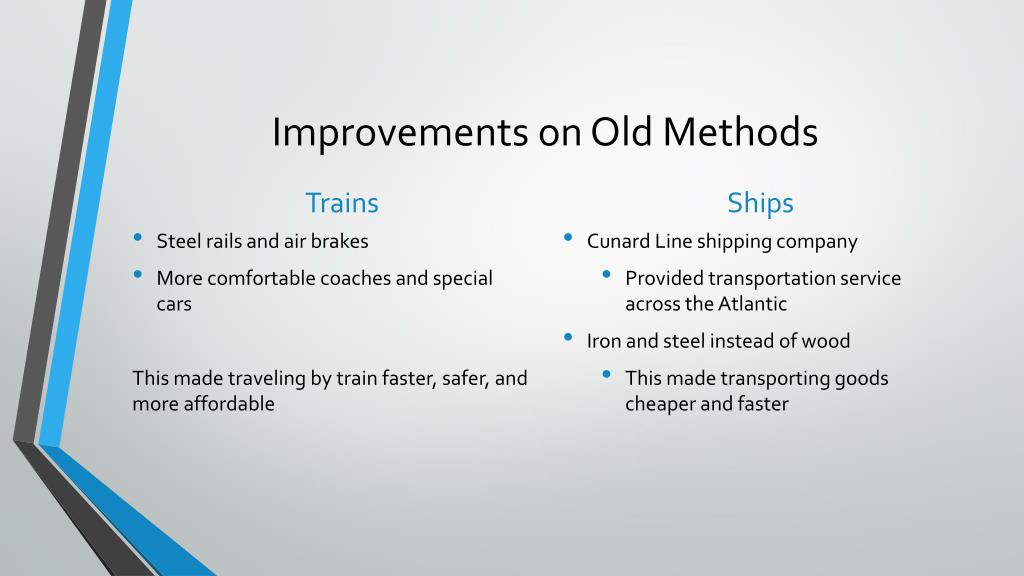 Improvements on Old Methods Trains Ships Cunard Line shipping company Provided transportation service across the Atlantic Iron and steel instead of wood This made transporting goods cheaper and faster • Steel rails and air brakes • More comfortable coaches and special cars This made traveling by train faster, safer, and more affordable