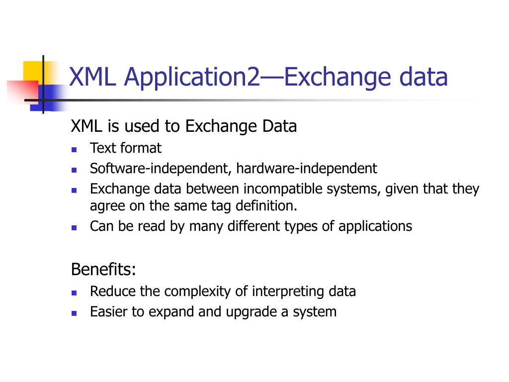 XML Application2—Exchange data XML is used to Exchange Data • Text format • Software-independent, hardware-independent • Exchange data between incompatible systems, given that they agree on the same tag definition. • Can be read by many different types of applications Benefits: • Reduce the complexity of interpreting data • Easier to expand and upgrade a system