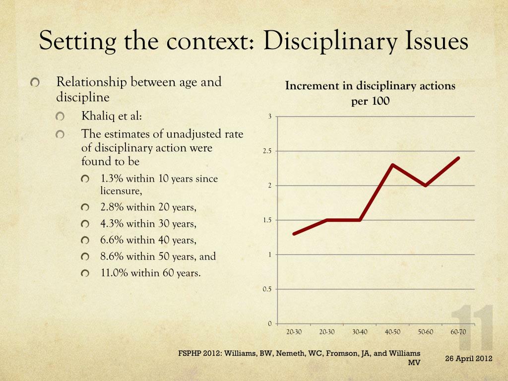 Setting the context: Disciplinary Issues • Relationship between age and discipline • Khaliq et al: • The estimates of unadjusted rate of disciplinary action were found to be • 1.3% within 10 years since licensure, • 2.8% within 20 years, • 4.3% within 30 years, • 6.6% within 40 years, • 8.6% within 50 years, and • 11.0% within 60 years. FSPHP 2012: Williams, BW, Nemeth, WC, Fromson, JA, and Williams MV
