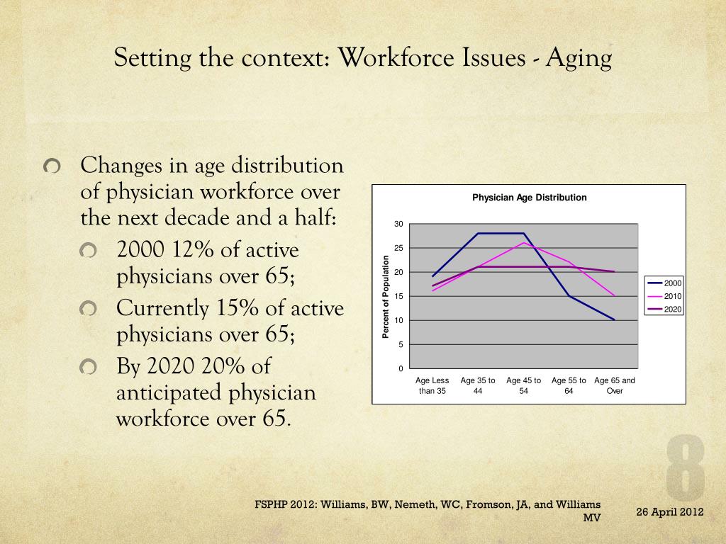 Setting the context: Workforce Issues - Aging • Changes in age distribution of physician workforce over the next decade and a half: • 2000 12% of active physicians over 65; • Currently 15% of active physicians over 65; • By 2020 20% of anticipated physician workforce over 65. FSPHP 2012: Williams, BW, Nemeth, WC, Fromson, JA, and Williams MV