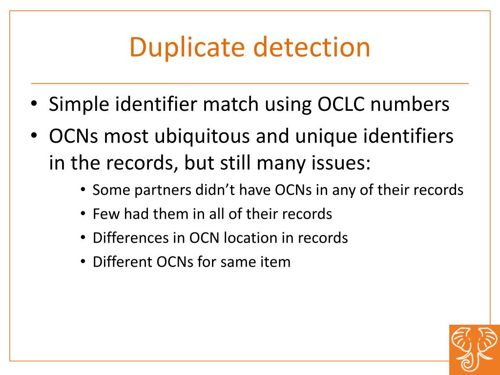 Duplicate detection • Simple identifier match using OCLC numbers • OCNs most ubiquitous and unique identifiers in the records, but still many issues: • Some partners didn’t have OCNs in any of their records • Few had them in all of their records • Differences in OCN location in records • Different OCNs for same item