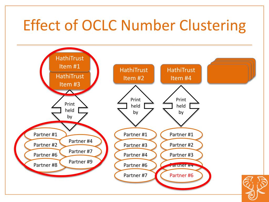 Effect of OCLC Number Clustering HathiTrust Item #1 HathiTrust Item #2 HathiTrust Item #4 HathiTrust Item #3 Print held by Print held by Print held by Partner #1 Partner #1 Partner #1 Partner #4 Partner #2 Partner #2 Partner #3 Partner #7 Partner #6 Partner #4 Partner #3 Partner #9 Partner #8 Partner #4 Partner #6 Partner #7 Partner #6