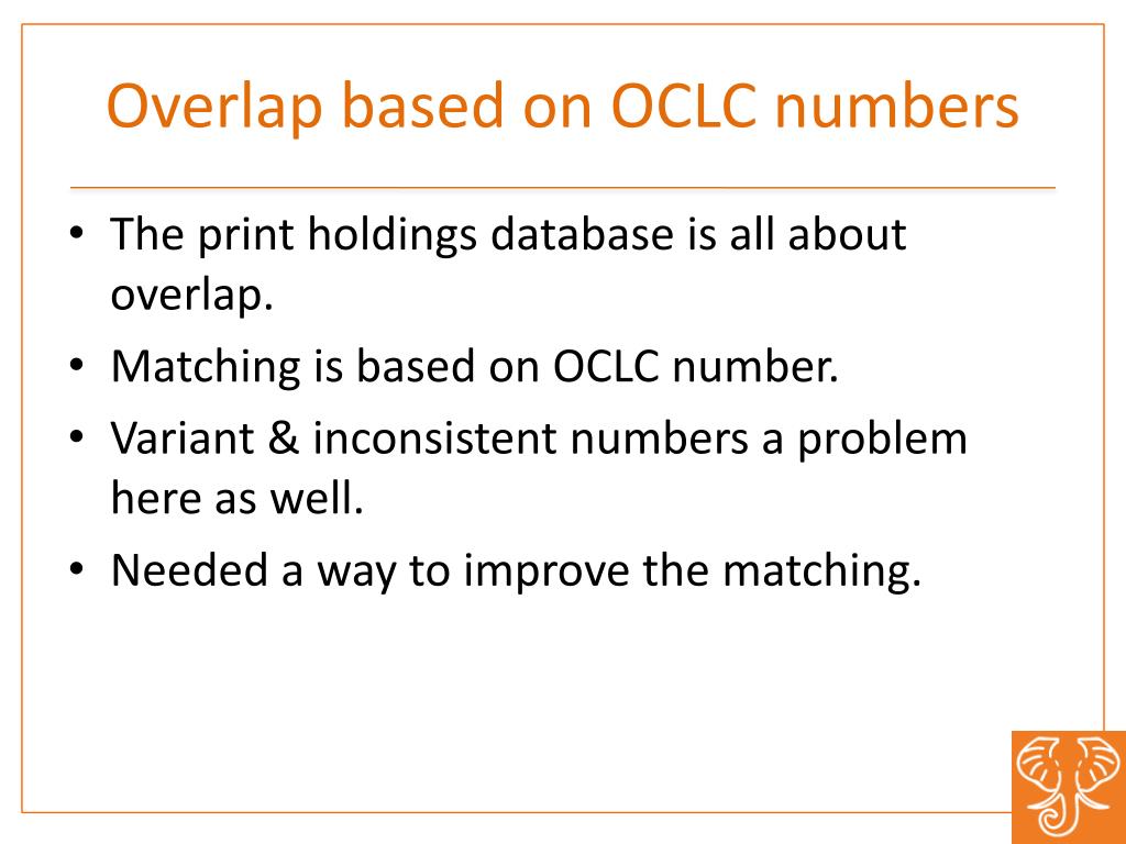 Overlap based on OCLC numbers • The print holdings database is all about overlap. • Matching is based on OCLC number. • Variant & inconsistent numbers a problem here as well. • Needed a way to improve the matching.