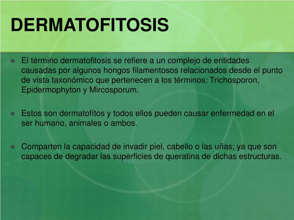 DERMATOFITOSIS • El término dermatofitosis se refiere a un complejo de entidades causadas por algunos hongos filamentosos relacionados desde el punto de vista taxonómico que pertenecen a los términos: Trichosporon, Epidermophyton y Mircosporum. • Estos son dermatofítos y todos ellos pueden causar enfermedad en el ser humano, animales o ambos. • Comparten la capacidad de invadir piel, cabello o las uñas; ya que son capaces de degradar las superficies de queratina de dichas estructuras.