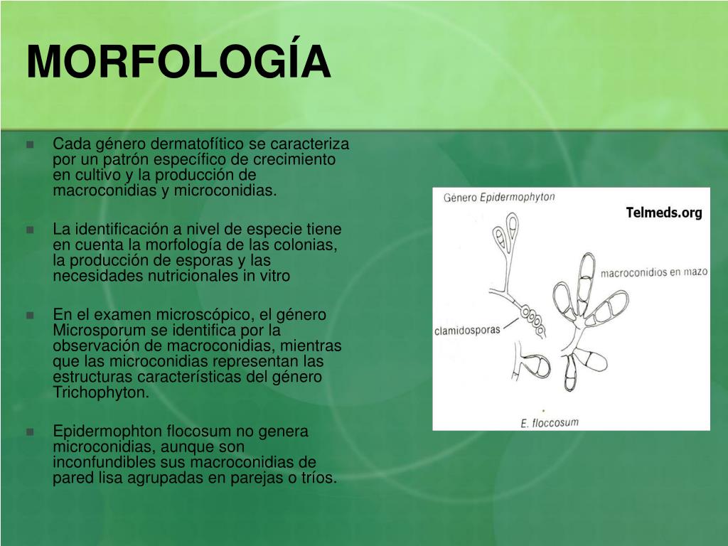 MORFOLOGÍA • Cada género dermatofítico se caracteriza por un patrón específico de crecimiento en cultivo y la producción de macroconidias y microconidias. • La identificación a nivel de especie tiene en cuenta la morfología de las colonias, la producción de esporas y las necesidades nutricionales in vitro • En el examen microscópico, el género Microsporum se identifica por la observación de macroconidias, mientras que las microconidias representan las estructuras características del género Trichophyton. • Epidermophton flocosum no genera microconidias, aunque son inconfundibles sus macroconidias de pared lisa agrupadas en parejas o tríos.