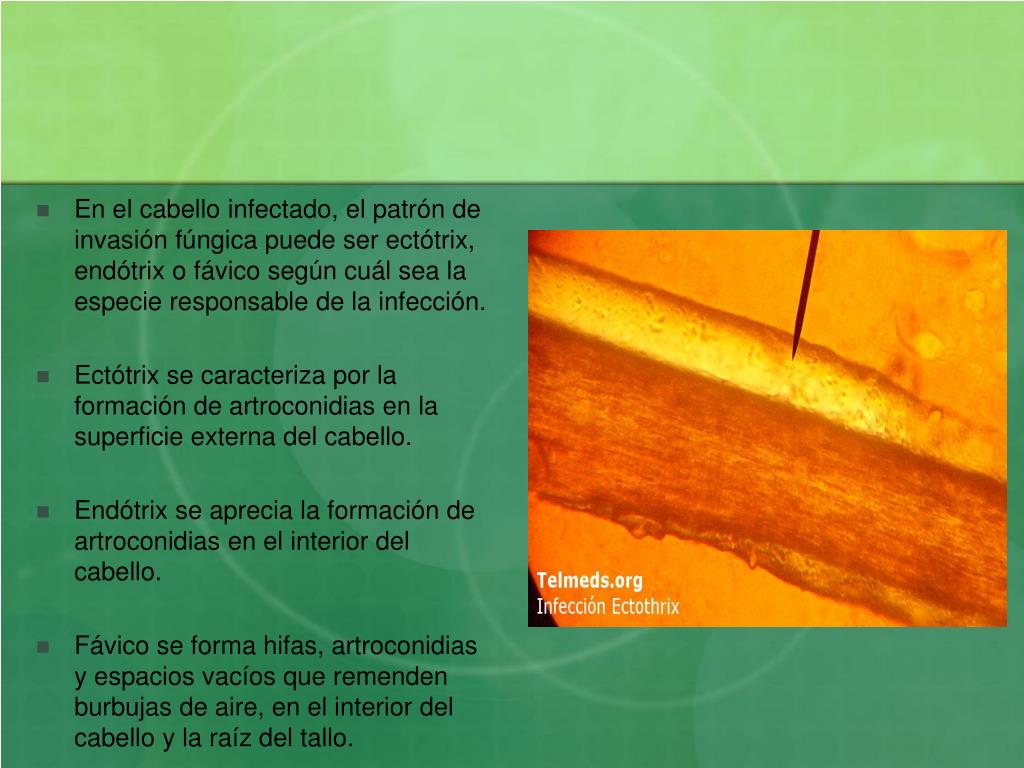 En el cabello infectado, el patrón de invasión fúngica puede ser ectótrix, endótrix o fávico según cuál sea la especie responsable de la infección. • Ectótrix se caracteriza por la formación de artroconidias en la superficie externa del cabello. • Endótrix se aprecia la formación de artroconidias en el interior del cabello. • Fávico se forma hifas, artroconidias y espacios vacíos que remenden burbujas de aire, en el interior del cabello y la raíz del tallo.