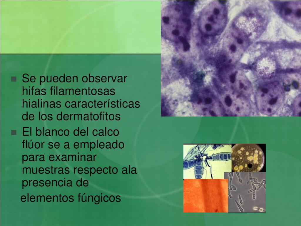 Se pueden observar hifas filamentosas hialinas características de los dermatofitos • El blanco del calco flúor se a empleado para examinar muestras respecto ala presencia de elementos fúngicos
