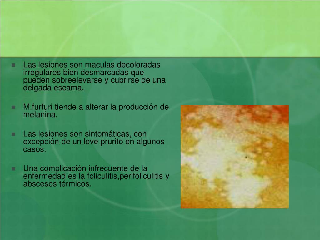 Las lesiones son maculas decoloradas irregulares bien desmarcadas que pueden sobreelevarse y cubrirse de una delgada escama. • M.furfuri tiende a alterar la producción de melanina. • Las lesiones son sintomáticas, con excepción de un leve prurito en algunos casos. • Una complicación infrecuente de la enfermedad es la foliculitis,perifoliculitis y abscesos térmicos.