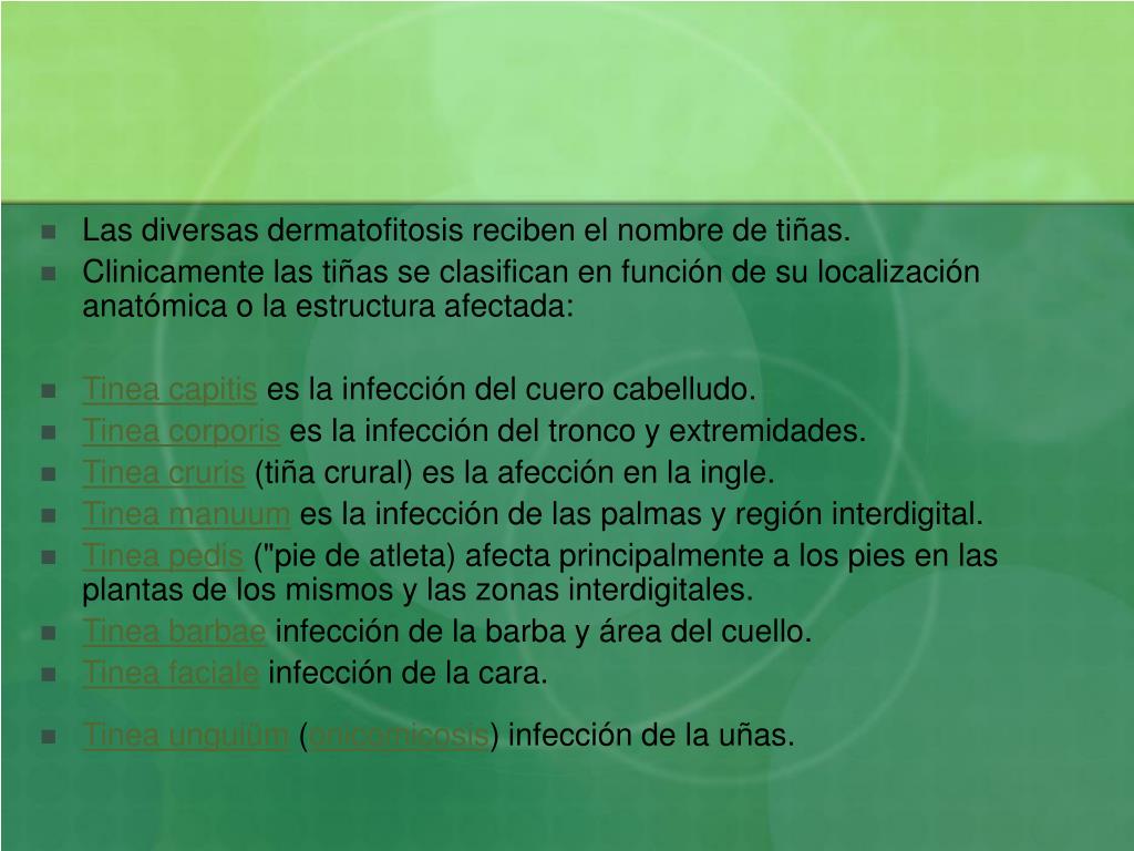 Las diversas dermatofitosis reciben el nombre de tiñas. • Clinicamente las tiñas se clasifican en función de su localización anatómica o la estructura afectada: • Tinea capitis es la infección del cuero cabelludo. • Tinea corporis es la infección del tronco y extremidades. • Tinea cruris (tiña crural) es la afección en la ingle. • Tinea manuum es la infección de las palmas y región interdigital. • Tinea pedis ("pie de atleta) afecta principalmente a los pies en las plantas de los mismos y las zonas interdigitales. • Tinea barbae infección de la barba y área del cuello. • Tinea faciale infección de la cara. • Tinea unguiüm (onicomicosis) infección de la uñas.
