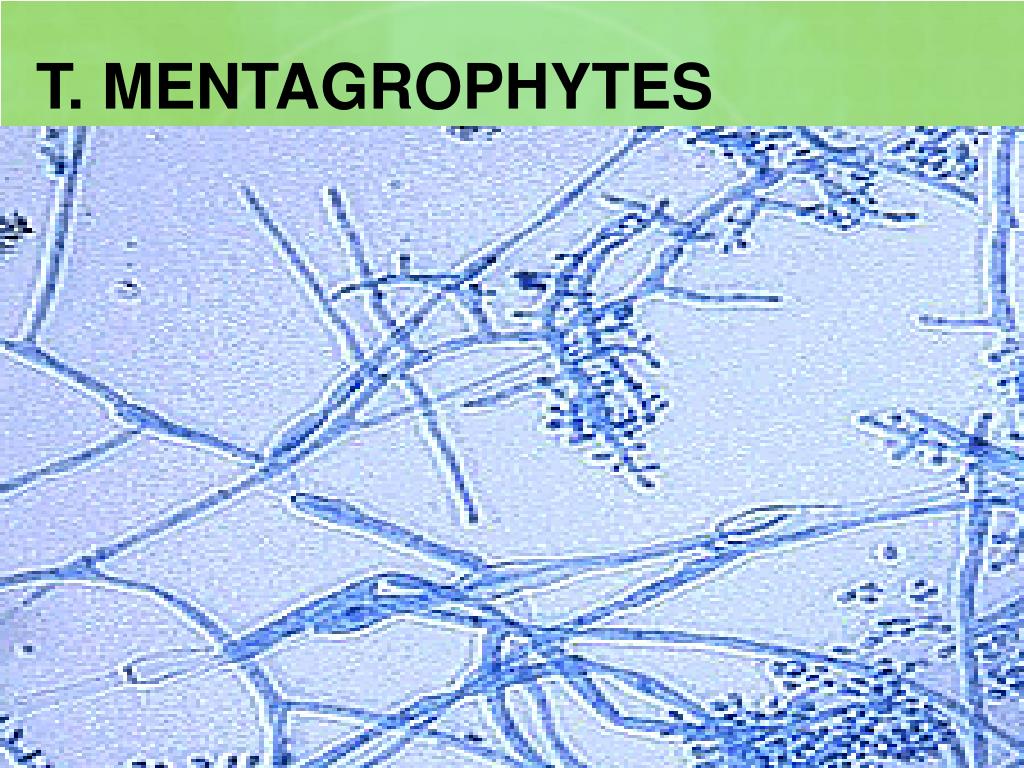 Microsporum canis produce unas macroconidias multicelulares características de pared gruesa y rugosa. • Trichophyton rubrum da lugar a microconidias piriformes que expone a ambos lados de sus hifas. • T. mentagrophytes genera macroconidias solitarias en forma de puro o bien en racimos de microconidias esféricas. • T. tonsurans origina microconidias de tamaño y forma variables, y un número relativamente grande conidias esféricas se halla en la proximidad de pequeñas conidias de paredes paralelas y otras microconidias de diversos tamaños y formas.