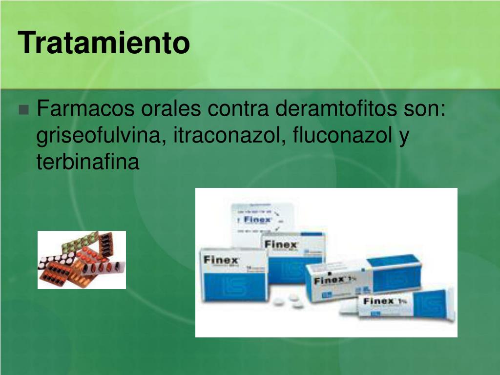 Tratamiento • Farmacos orales contra deramtofitos son: griseofulvina, itraconazol, fluconazol y terbinafina