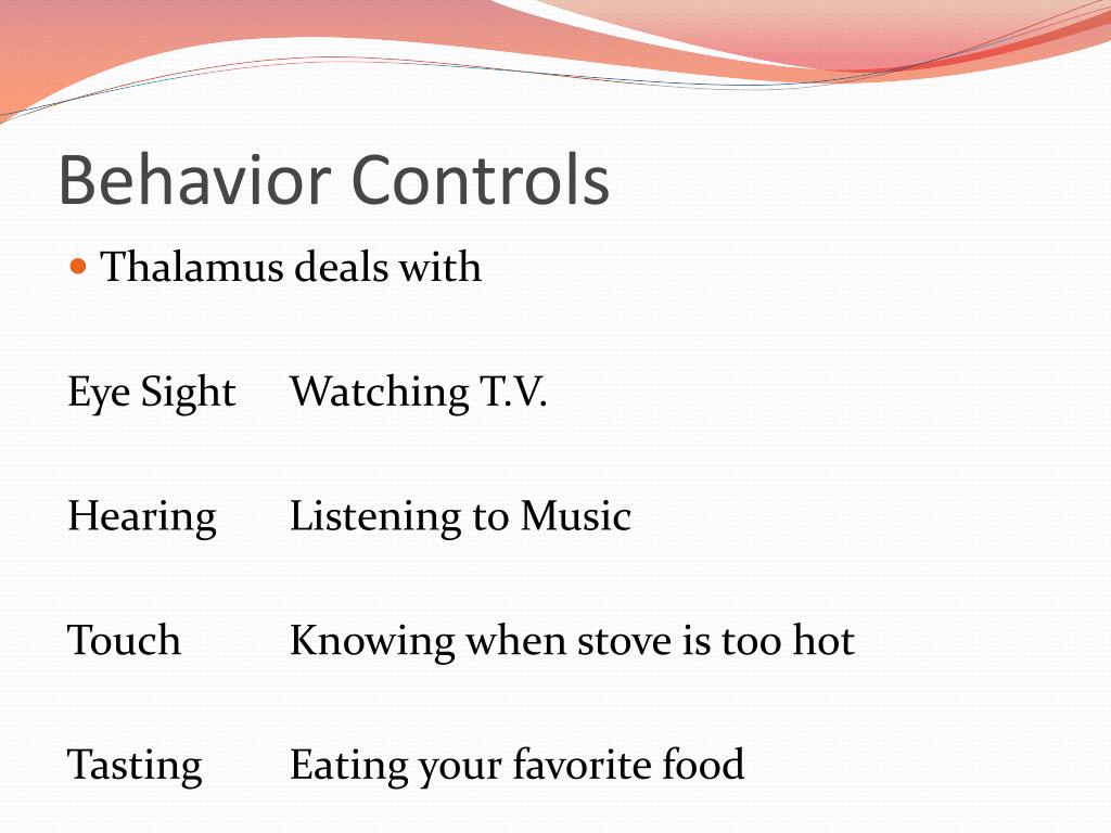 Behavior Controls • Thalamus deals with Eye Sight Watching T.V. Hearing Listening to Music Touch Knowing when stove is too hot Tasting Eating your favorite food