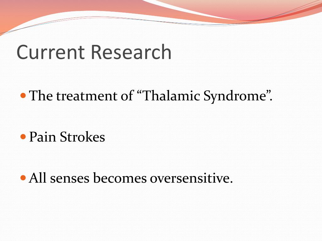 Current Research • The treatment of “Thalamic Syndrome”. • Pain Strokes • All senses becomes oversensitive.