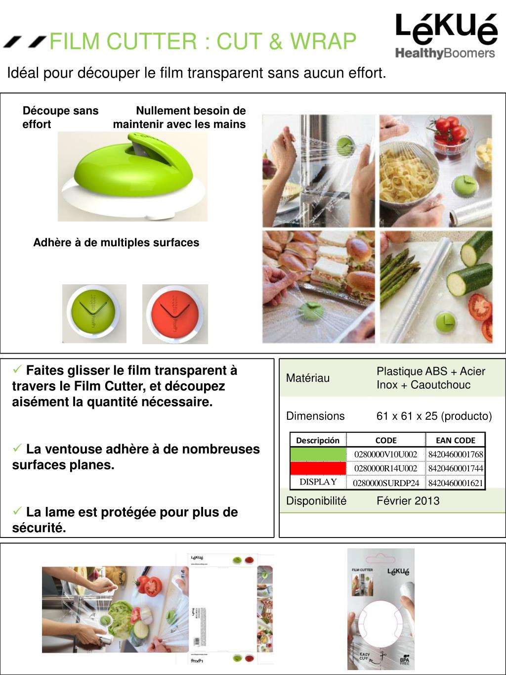 FILM CUTTER : CUT & WRAP Idéalpourdécouper le film transparentsansaucuneffort. Découpe sans effort Nullementbesoin de maintenir avec les mains Adhère à de multiples surfaces • Faitesglisser le film transparent à travers le Film Cutter, et découpezaisément la quantiténécessaire. • La ventouseadhère à de nombreuses surfaces planes. • La lame estprotégéepour plus de sécurité.