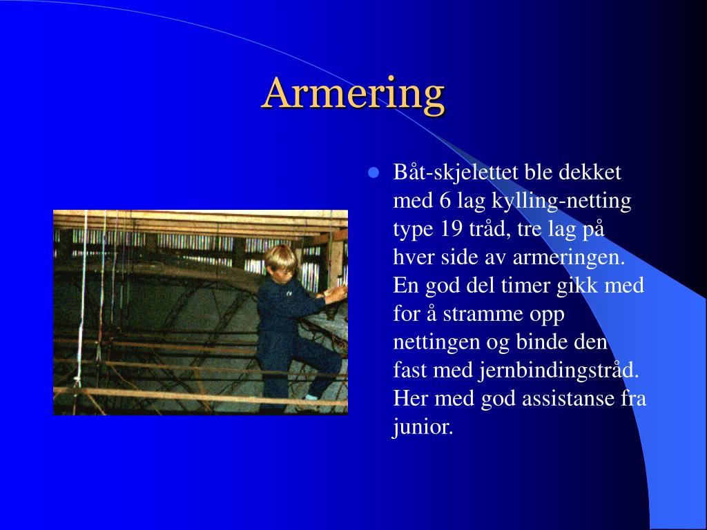 Armering • Båt-skjelettet ble dekket med 6 lag kylling-netting type 19 tråd, tre lag på hver side av armeringen. En god del timer gikk med for å stramme opp nettingen og binde den fast med jernbindingstråd. Her med god assistanse fra junior.