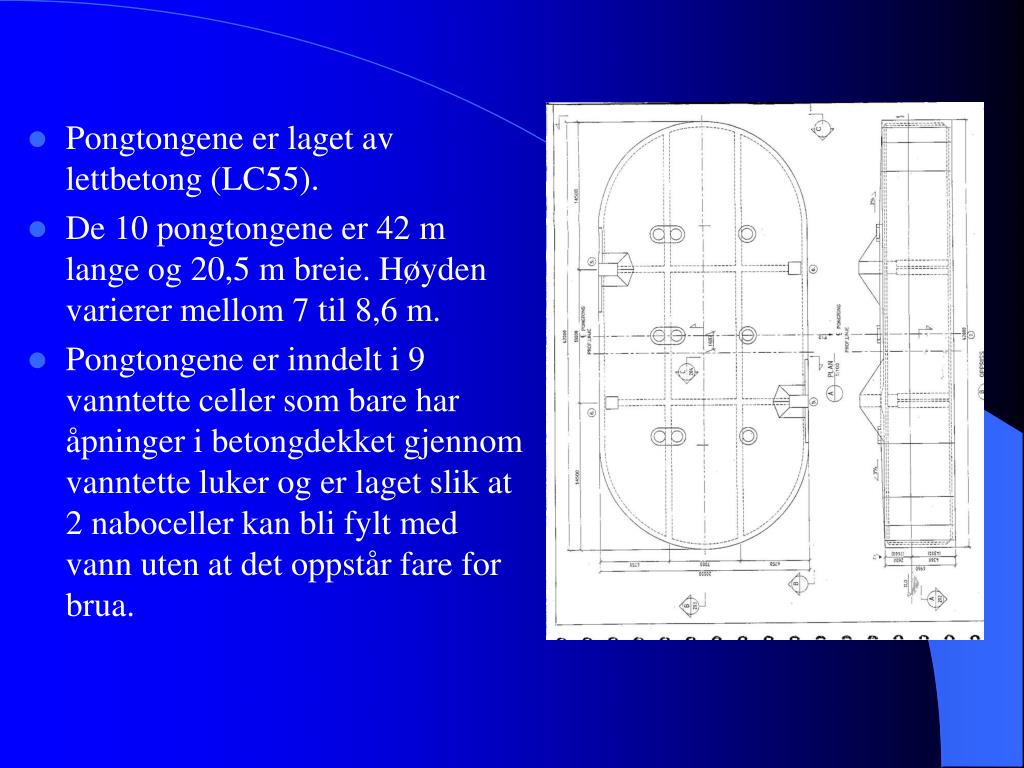 Når pongtongene er belastet stikker de mellom 4,3 til 5,6 m under vannoverflaten. • På Nordhordlandsbrua står pongtongene med 113,25 meters mellomrom. • Det er brukt både slakkarmering og spennarmering i pongtongene.