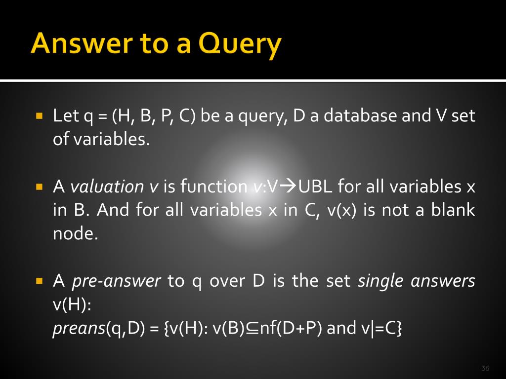 Answer to a Query • Let q = (H, B, P, C) be a query, D a database and V set of variables. • A valuation v is function v:VUBL for all variables x in B. And for all variables x in C, v(x) is not a blank node. • A pre-answer to q over D is the set single answers v(H): preans(q,D) = {v(H): v(B)⊆nf(D+P) and v|=C}