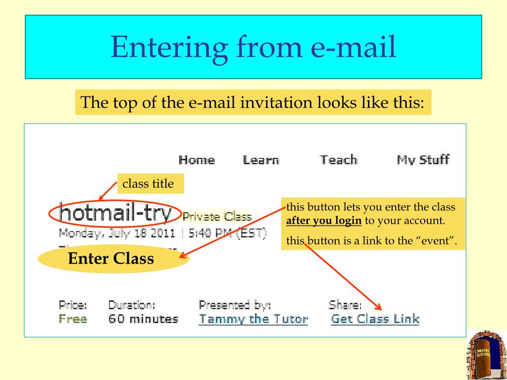 this button lets you enter the classafter you login to your account. this button is a link to the “event”. Enter Class Entering from e-mail The top of the e-mail invitation looks like this: class title