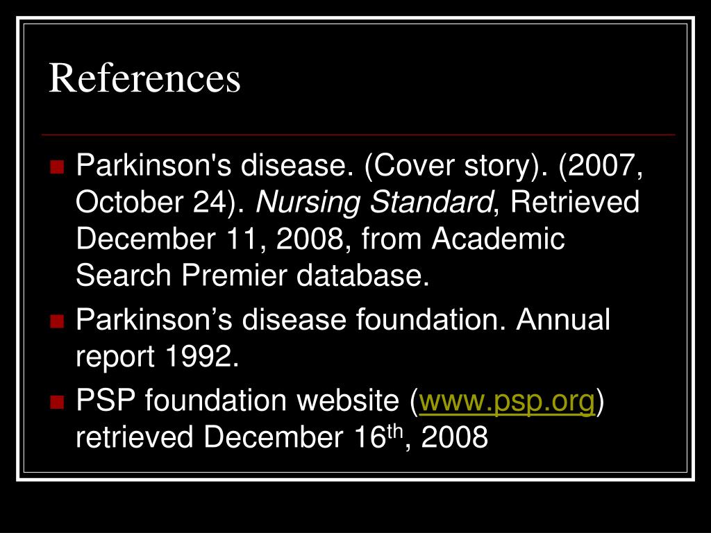 References Parkinson's disease. (Cover story). (2007, October 24). Nursing Standard, Retrieved December 11, 2008, from Academic Search Premier database. Parkinson’s disease foundation. Annual report 1992. PSP foundation website (www.psp.org) retrieved December 16th, 2008