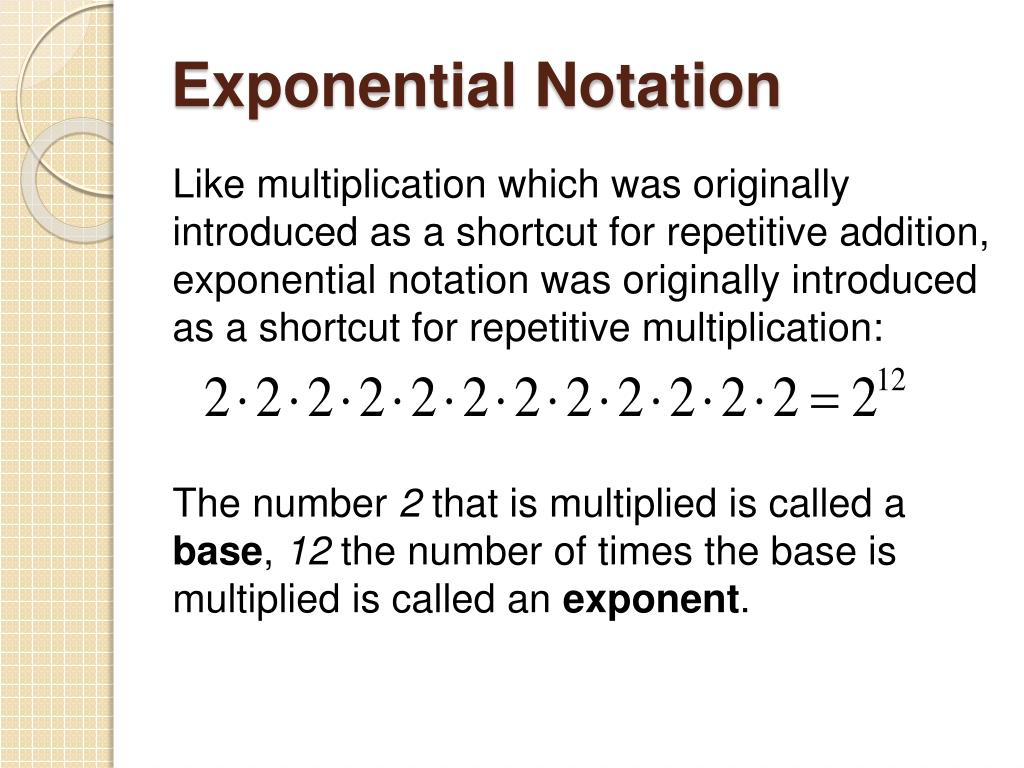 Exponential Notation Like multiplication which was originally introduced as a shortcut for repetitive addition, exponential notation was originally introduced as a shortcut for repetitive multiplication: The number 2 that is multiplied is called a base, 12 the number of times the base is multiplied is called an exponent.