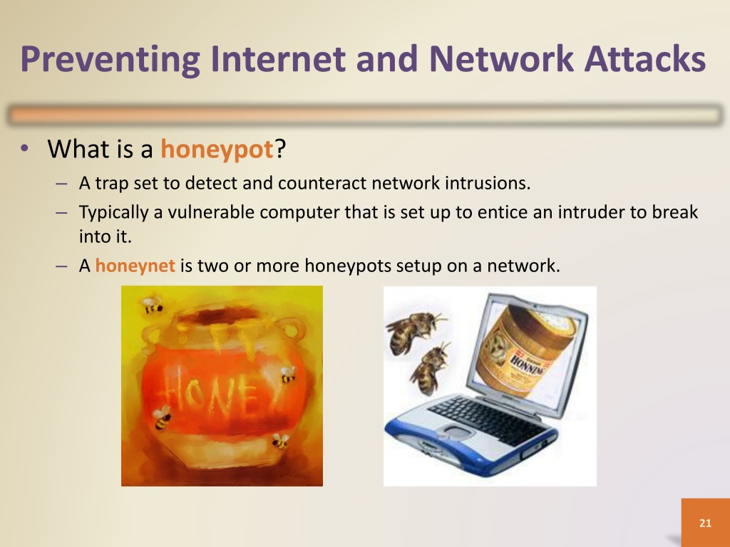 Preventing Internet and Network Attacks • What is a honeypot? • A trap set to detect and counteract network intrusions. • Typically a vulnerable computer that is set up to entice an intruder to break into it. • A honeynet is two or more honeypots setup on a network.