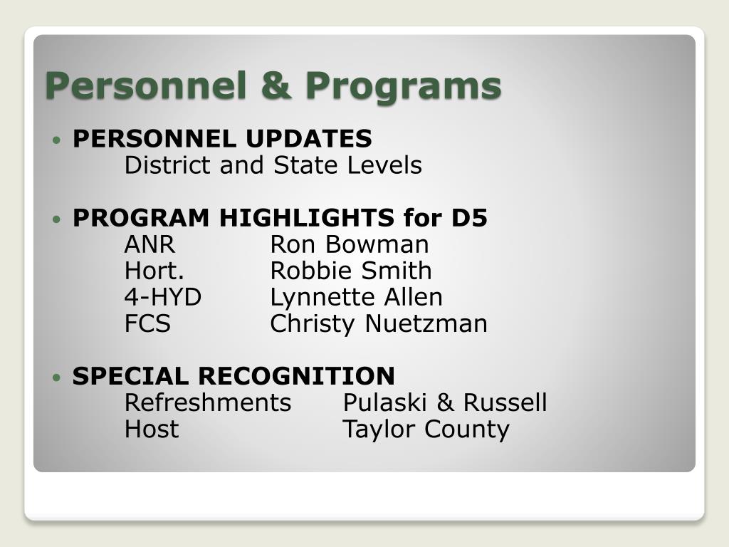 PERSONNEL UPDATES District and State Levels • PROGRAM HIGHLIGHTS for D5 ANR Ron Bowman Hort. Robbie Smith 4-HYDLynnette Allen FCS Christy Nuetzman • SPECIAL RECOGNITION Refreshments Pulaski & Russell Host Taylor County Personnel & Programs
