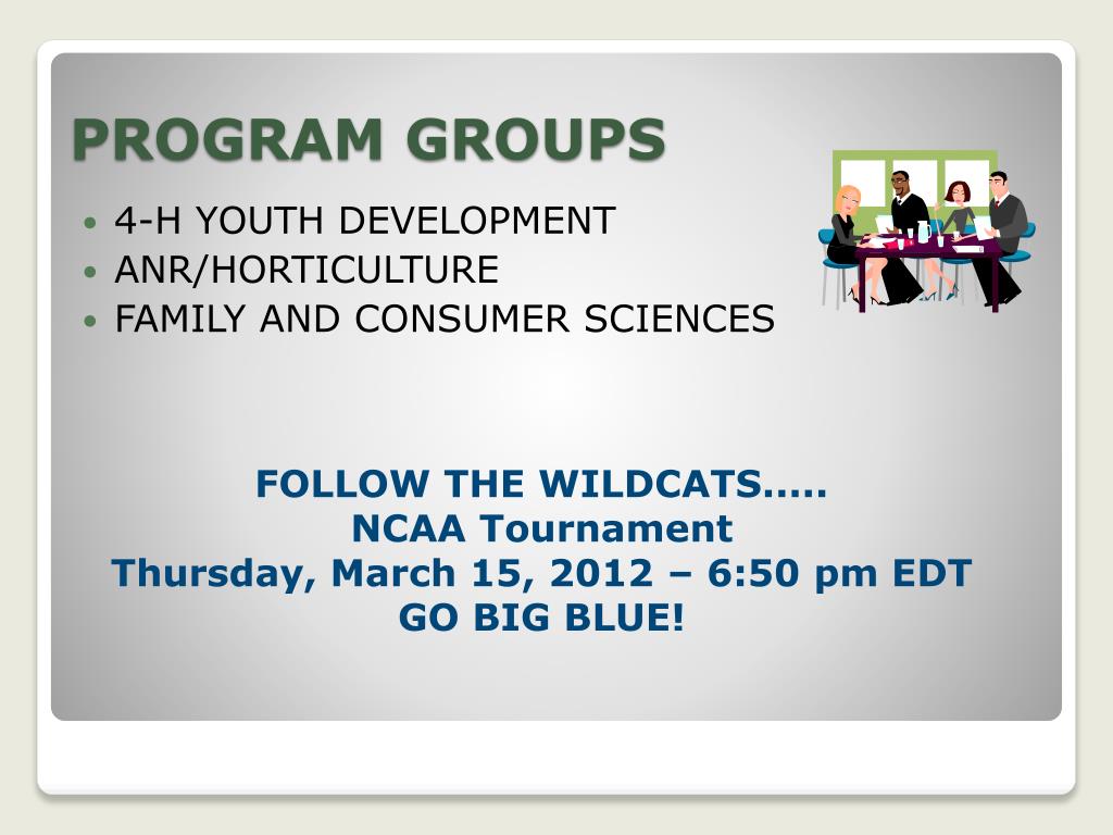 4-H YOUTH DEVELOPMENT • ANR/HORTICULTURE • FAMILY AND CONSUMER SCIENCES • FOLLOW THE WILDCATS..... • NCAA Tournament • Thursday, March 15, 2012 – 6:50 pm EDT • GO BIG BLUE! PROGRAM GROUPS