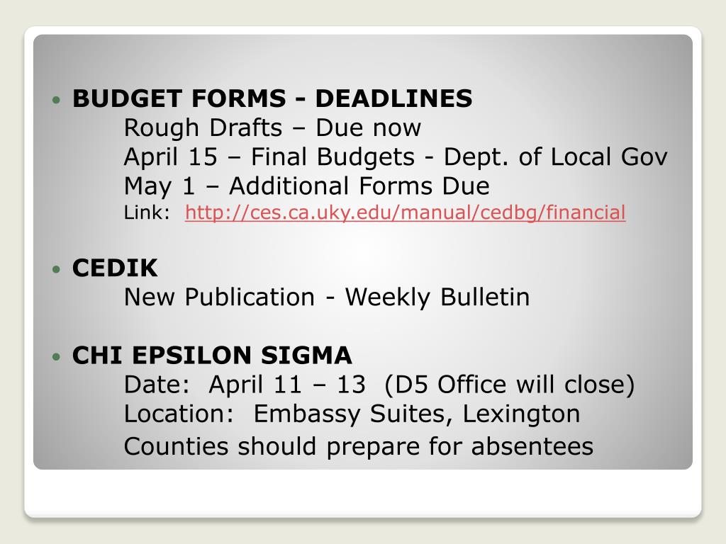 BUDGET FORMS - DEADLINES Rough Drafts – Due now April 15 – Final Budgets - Dept. of Local Gov May 1 – Additional Forms Due Link: http://ces.ca.uky.edu/manual/cedbg/financial • CEDIK New Publication - Weekly Bulletin • CHI EPSILON SIGMA Date: April 11 – 13 (D5 Office will close) Location: Embassy Suites, Lexington Counties should prepare for absentees