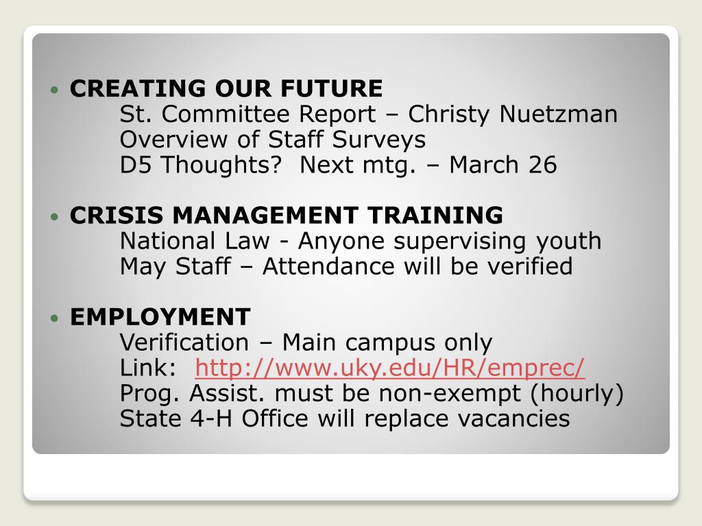 CREATING OUR FUTURE St. Committee Report – Christy Nuetzman Overview of Staff Surveys D5 Thoughts? Next mtg. – March 26 • CRISIS MANAGEMENT TRAINING National Law - Anyone supervising youth May Staff – Attendance will be verified • EMPLOYMENT Verification – Main campus only Link: http://www.uky.edu/HR/emprec/ Prog. Assist. must be non-exempt (hourly) State 4-H Office will replace vacancies