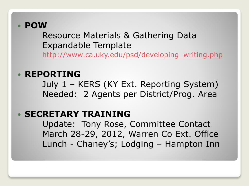 POW Resource Materials & Gathering Data Expandable Template http://www.ca.uky.edu/psd/developing_writing.php • REPORTING July 1 – KERS (KY Ext. Reporting System) Needed: 2 Agents per District/Prog. Area • SECRETARY TRAINING Update: Tony Rose, Committee Contact March 28-29, 2012, Warren Co Ext. Office Lunch - Chaney’s; Lodging – Hampton Inn