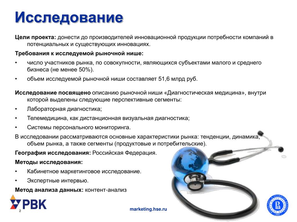 Исследование • Цели проекта: донести до производителей инновационной продукции потребности компаний в потенциальных и существующих инновациях. • Требования к исследуемой рыночной нише: • число участников рынка, по совокупности, являющихся субъектами малого и среднего бизнеса (не менее 50%). • объем исследуемой рыночной ниши составляет 51,6 млрд руб. • Исследование посвящено описанию рыночной ниши «Диагностическая медицина», внутри которой выделены следующие перспективные сегменты: • Лабораторная диагностика; • Телемедицина, как дистанционная визуальная диагностика; • Системы персонального мониторинга. • В исследовании рассматриваются основные характеристики рынка: тенденции, динамика, объем рынка, а также сегменты (продуктовые и потребительские). • География исследования: Российская Федерация. • Методы исследования: • Кабинетное маркетинговое исследование. • Экспертные интервью. • Метод анализа данных: контент-анализ marketing.hse.ru